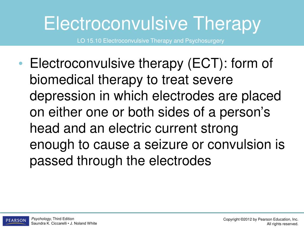 Electroconvulsive Therapy LO 15.10 Electroconvulsive Therapy and Psychosurgery • Electroconvulsive therapy (ECT): form of biomedical therapy to treat severe depression in which electrodes are placed on either one or both sides of a person’s head and an electric current strong enough to cause a seizure or convulsion is passed through the electrodes