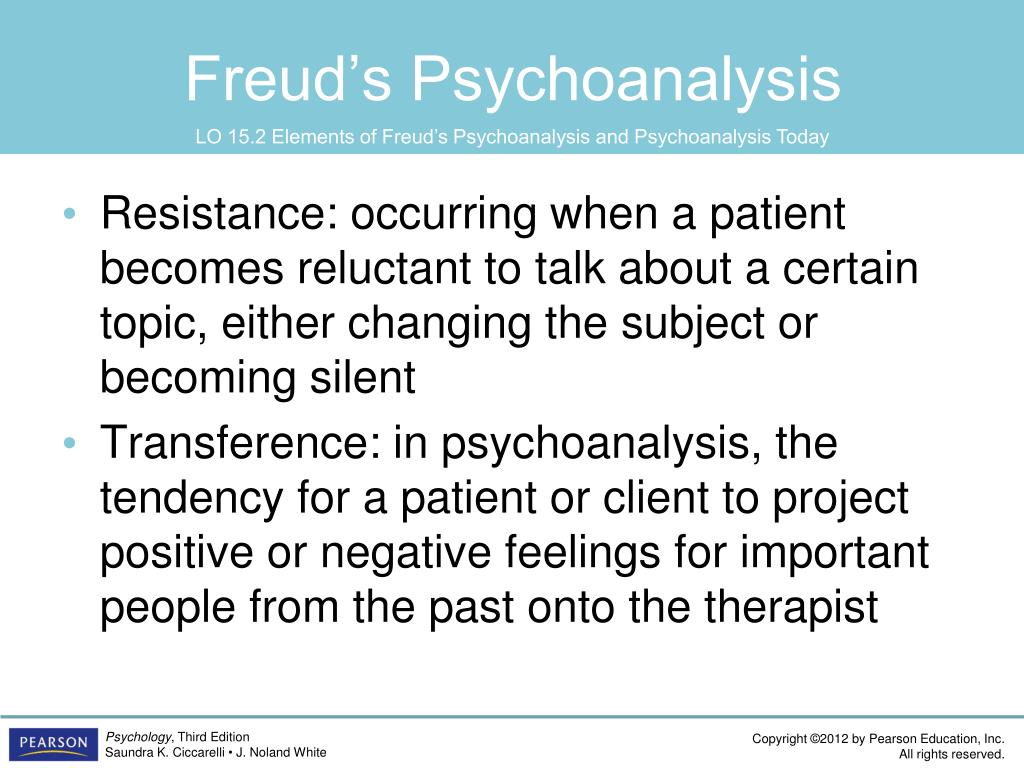 Freud’s Psychoanalysis LO 15.2 Elements of Freud’s Psychoanalysis and Psychoanalysis Today • Resistance: occurring when a patient becomes reluctant to talk about a certain topic, either changing the subject or becoming silent • Transference: in psychoanalysis, the tendency for a patient or client to project positive or negative feelings for important people from the past onto the therapist