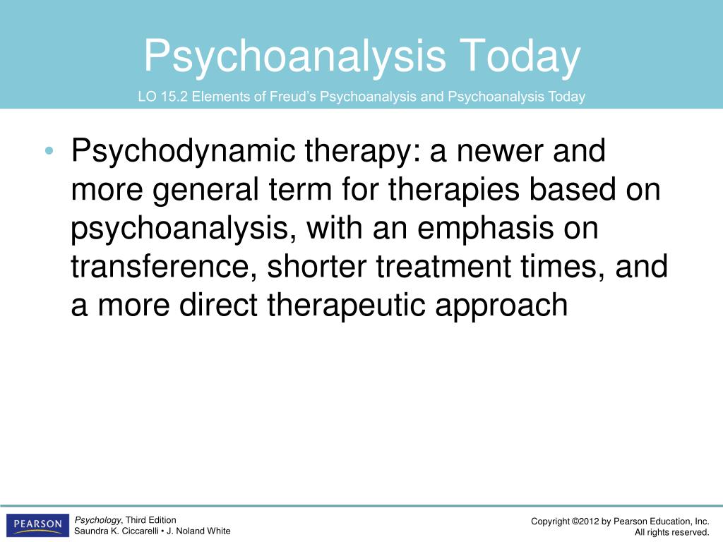 Psychoanalysis Today LO 15.2 Elements of Freud’s Psychoanalysis and Psychoanalysis Today • Psychodynamic therapy: a newer and more general term for therapies based on psychoanalysis, with an emphasis on transference, shorter treatment times, and a more direct therapeutic approach