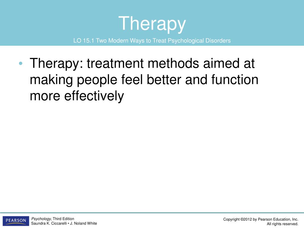 Therapy LO 15.1 Two Modern Ways to Treat Psychological Disorders • Therapy: treatment methods aimed at making people feel better and function more effectively