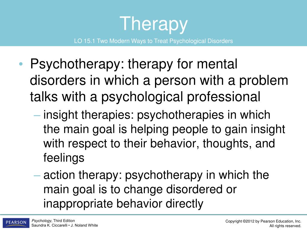Therapy LO 15.1 Two Modern Ways to Treat Psychological Disorders • Psychotherapy: therapy for mental disorders in which a person with a problem talks with a psychological professional • insight therapies: psychotherapies in which the main goal is helping people to gain insight with respect to their behavior, thoughts, and feelings • action therapy: psychotherapy in which the main goal is to change disordered or inappropriate behavior directly
