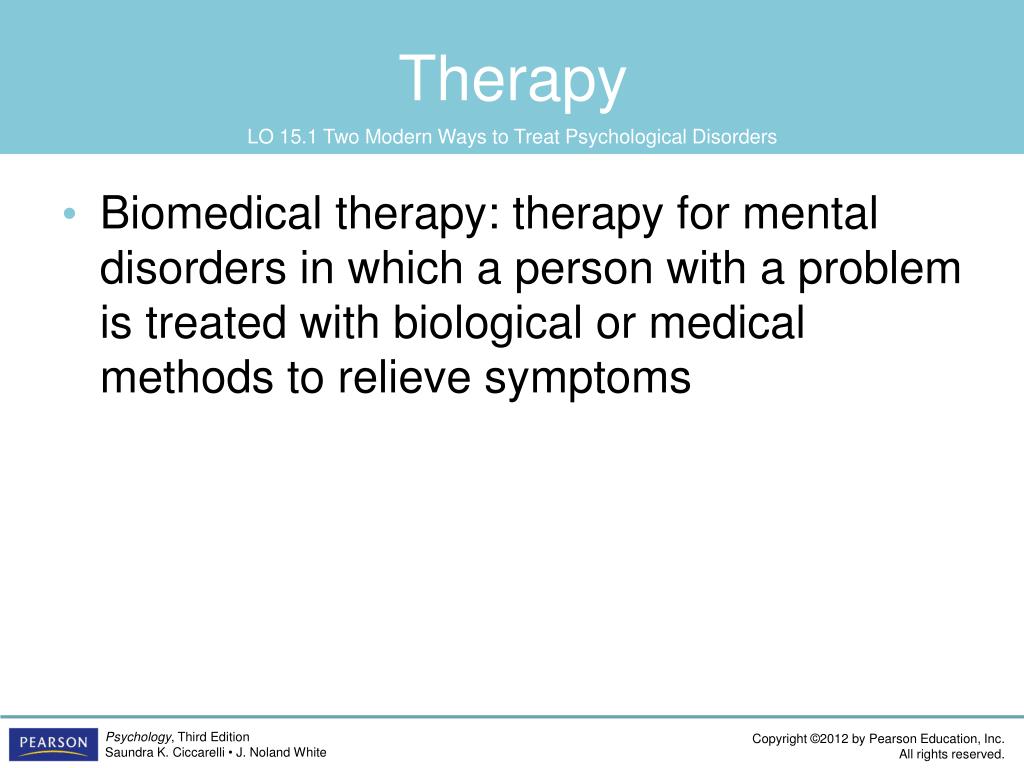 Therapy LO 15.1 Two Modern Ways to Treat Psychological Disorders • Biomedical therapy: therapy for mental disorders in which a person with a problem is treated with biological or medical methods to relieve symptoms