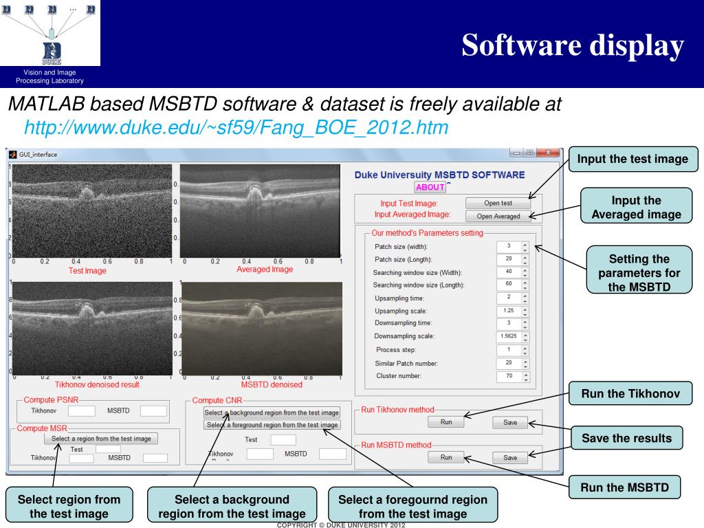 Software display MATLAB based MSBTD software & dataset is freely available at http://www.duke.edu/~sf59/Fang_BOE_2012.htm Input the test image Input the Averaged image Setting the parameters for the MSBTD Run the Tikhonov Save the results Run the MSBTD Select region from the test image Select a background region from the test image Select a foregournd region from the test image