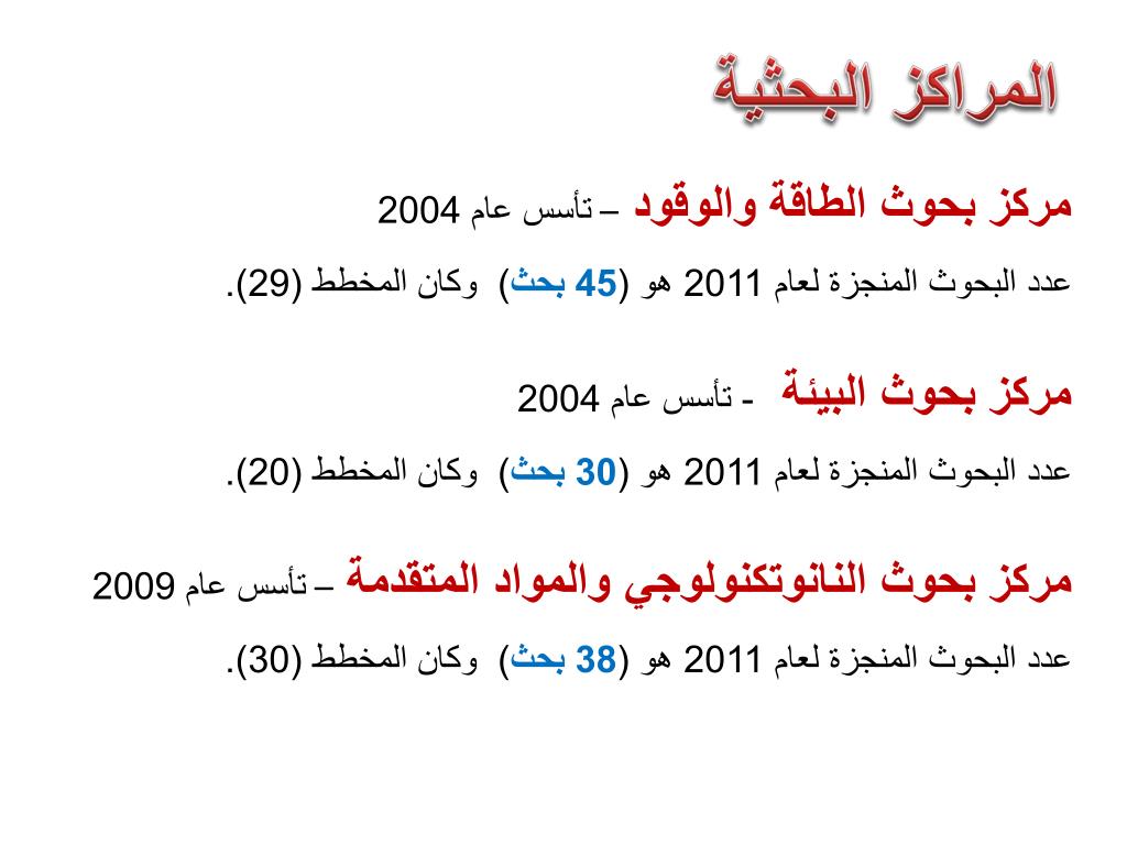المراكز البحثية مركز بحوث الطاقة والوقود – تأسس عام 2004 عدد البحوث المنجزة لعام 2011 هو (45 بحث) وكان المخطط (29). مركز بحوث البيئة - تأسس عام 2004 عدد البحوث المنجزة لعام 2011 هو (30 بحث) وكان المخطط (20). مركز بحوث النانوتكنولوجي والمواد المتقدمة – تأسس عام 2009 عدد البحوث المنجزة لعام 2011 هو (38 بحث) وكان المخطط (30).