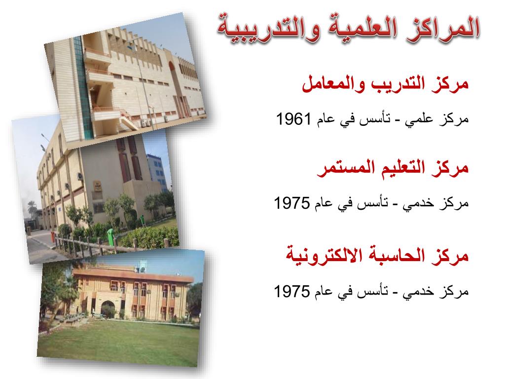 المراكز العلمية والتدريبية مركز التدريب والمعامل مركز علمي - تأسس في عام 1961 مركز التعليم المستمر مركز خدمي - تأسس في عام 1975 مركز الحاسبة الالكترونية مركز خدمي - تأسس في عام 1975