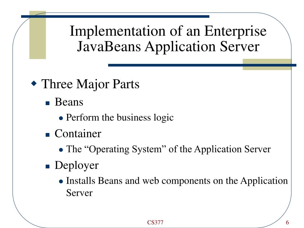 Implementation of an Enterprise JavaBeans Application Server • Three Major Parts • Beans • Perform the business logic • Container • The “Operating System” of the Application Server • Deployer • Installs Beans and web components on the Application Server CS377