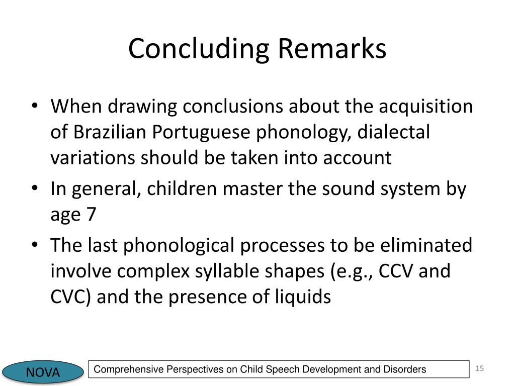 Concluding Remarks When drawing conclusions about the acquisition of Brazilian Portuguese phonology, dialectal variations should be taken into account In general, children master the sound system by age 7 The last phonological processes to be eliminated involve complex syllable shapes (e.g., CCV and CVC) and the presence of liquids