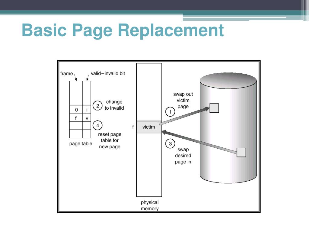 Basic Page Replacement • Find the location of the desired page on disk. • Find a free frame: - If there is a free frame, use it. - If there is no free frame, use a page replacement algorithm to select a victim frame. • Read the desired page into the (newly) free frame. Update the page and frame tables. • Restart the process.
