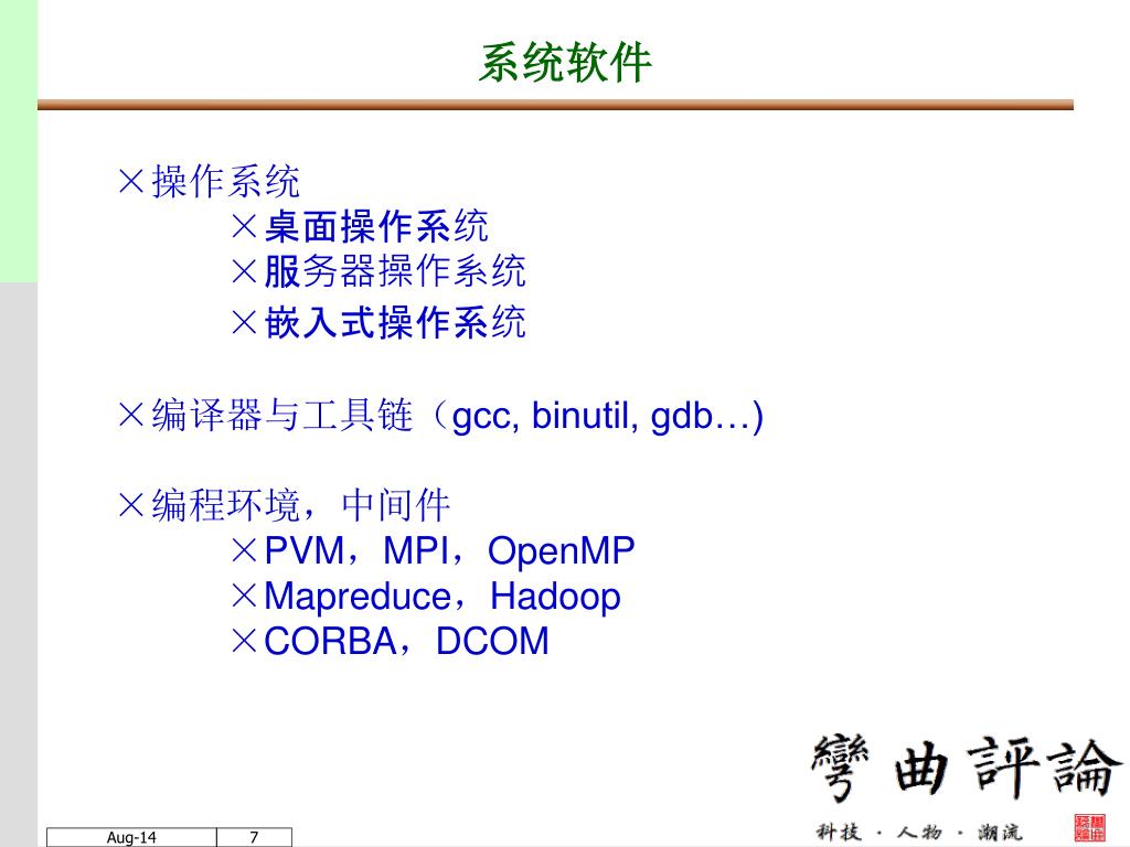 ×操作系统×桌面操作系统 ×服务器操作系统 ×嵌入式操作系统×编译器与工具链(gcc, binutil, gdb…)×编程环境,中间件×PVM,MPI,OpenMP ×Mapreduce,Hadoop ×CORBA,DCOM 系统软件