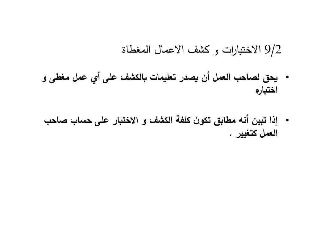 9/2 الاختبارات و كشف الاعمال المغطاة • يحق لصاحب العمل أن يصدر تعليمات بالكشف على أي عمل مغطى و اختباره • إذا تبين أنه مطابق تكون كلفة الكشف و الاختبار على حساب صاحب العمل كتغيير .
