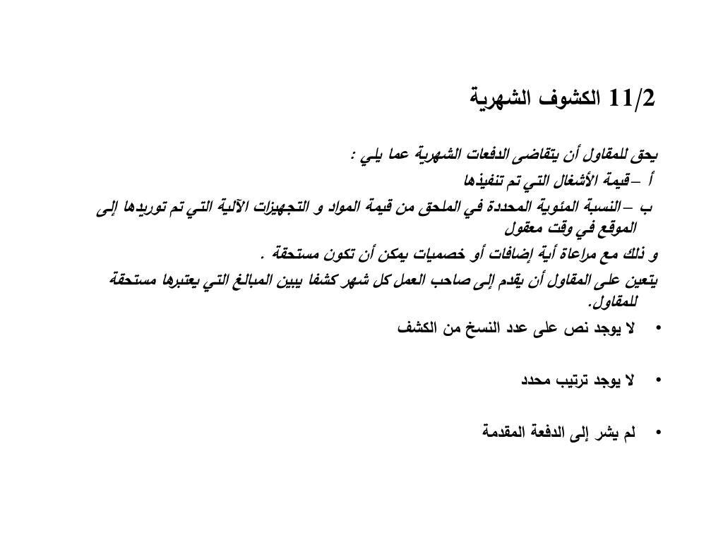 11/2 الكشوف الشهرية يحق للمقاول أن يتقاضى الدفعات الشهرية عما يلي : أ – قيمة الأشغال التي تم تنفيذها ب – النسبة المئوية المحددة في الملحق من قيمة المواد و التجهيزات الآلية التي تم توريدها إلى الموقع في وقت معقول و ذلك مع مراعاة أية إضافات أو خصميات يمكن أن تكون مستحقة . يتعين على المقاول أن يقدم إلى صاحب العمل كل شهر كشفا يبين المبالغ التي يعتبرها مستحقة للمقاول. • لا يوجد نص على عدد النسخ من الكشف • لا يوجد ترتيب محدد • لم يشر إلى الدفعة المقدمة