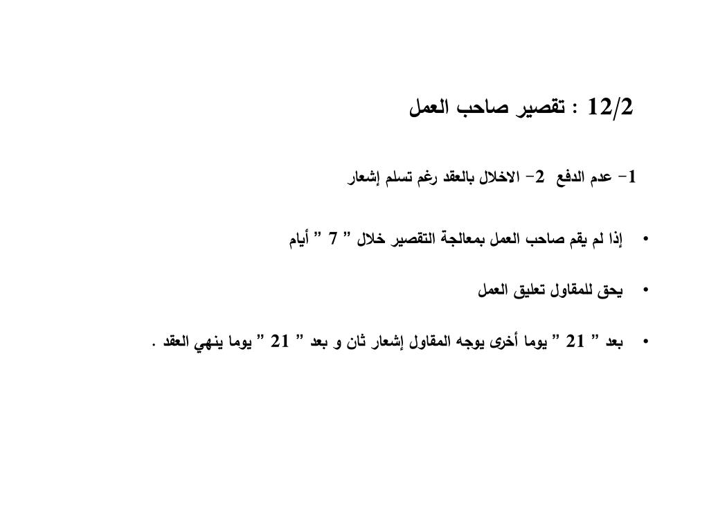 12/2 : تقصير صاحب العمل 1- عدم الدفع 2- الاخلال بالعقد رغم تسلم إشعار • إذا لم يقم صاحب العمل بمعالجة التقصير خلال ” 7 ” أيام • يحق للمقاول تعليق العمل • بعد ” 21 ” يوما أخرى يوجه المقاول إشعار ثان و بعد ” 21 ” يوما ينهي العقد .