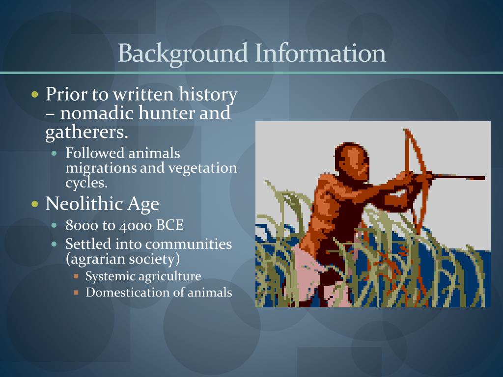 Background Information • Prior to written history – nomadic hunter and gatherers. • Followed animals migrations and vegetation cycles. • Neolithic Age • 8000 to 4000 BCE • Settled into communities (agrarian society) • Systemic agriculture • Domestication of animals