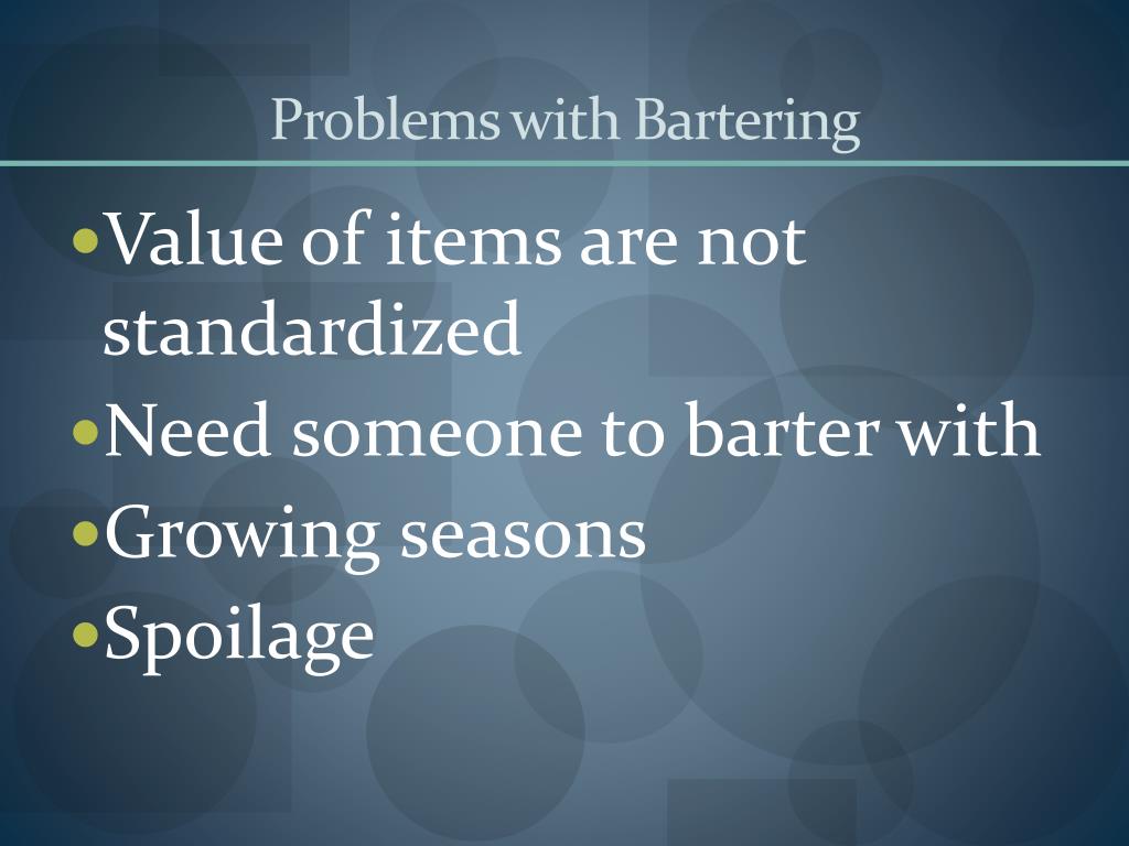 Problems with Bartering • Value of items are not standardized • Need someone to barter with • Growing seasons • Spoilage