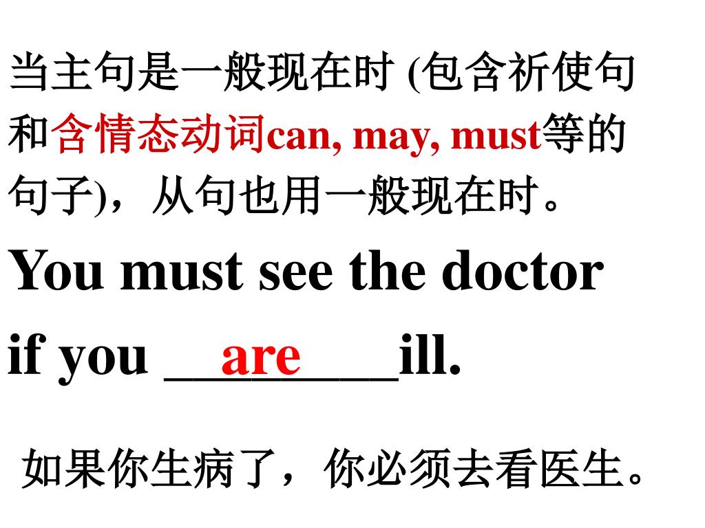 当主句是一般现在时 (包含祈使句和含情态动词can, may, must等的句子),从句也用一般现在时。You must see the doctor if you ________ill. 如果你生病了,你必须去看医生。 are