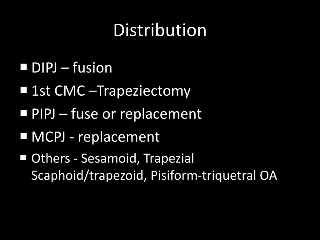 Distribution • DIPJ – fusion • 1st CMC –Trapeziectomy • PIPJ – fuse or replacement • MCPJ - replacement • Others - Sesamoid, Trapezial Scaphoid/trapezoid, Pisiform-triquetral OA