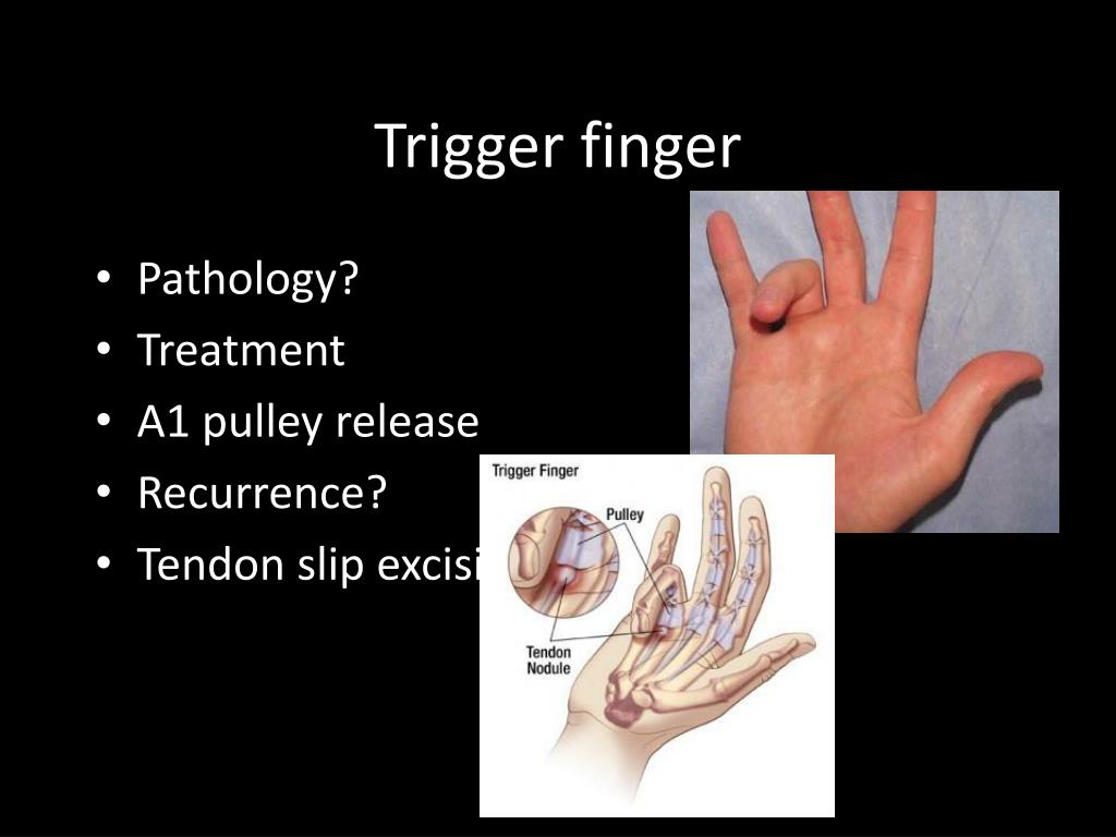 Trigger finger • Pathology? • Treatment • A1 pulley release • Recurrence? • Tendon slip excision