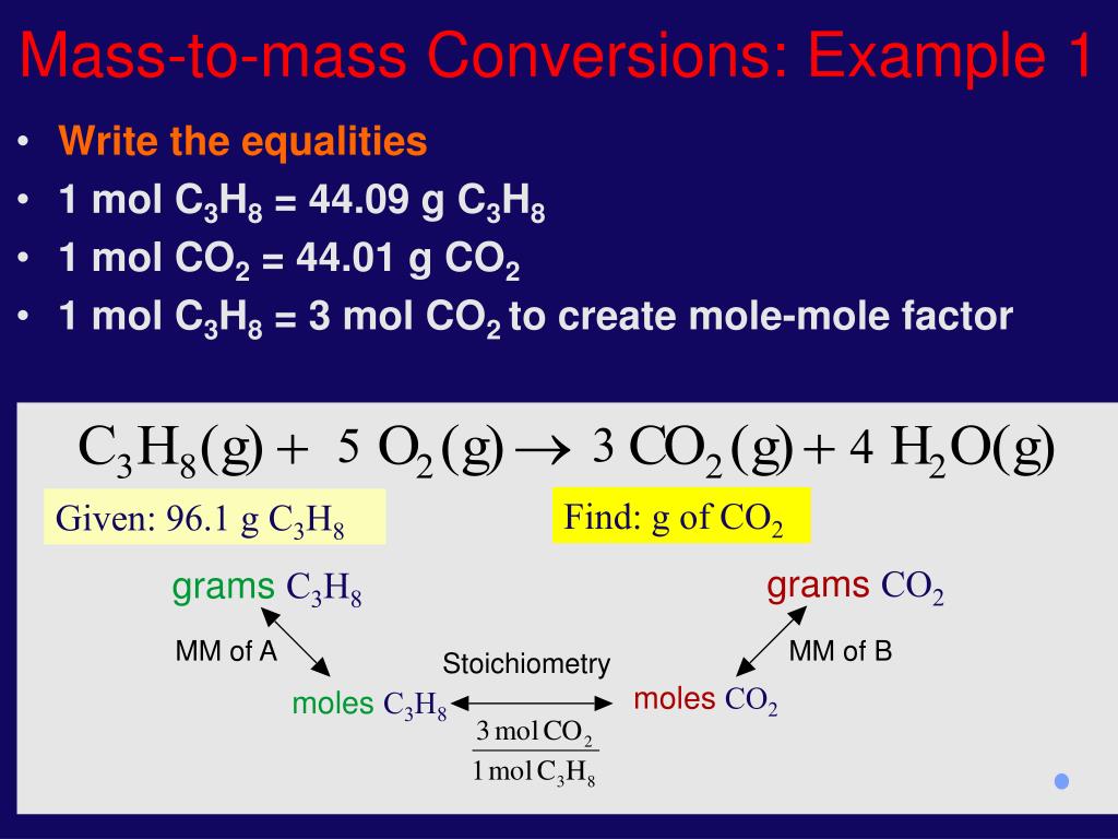 Mass-to-mass Conversions: Example 1 grams CO2 grams C3H8 MM of A MM of B Stoichiometry moles CO2 moles C3H8 moles B moles A • Write the equalities • 1 mol C3H8 = 44.09 g C3H8 • 1 mol CO2 = 44.01 g CO2 • 1 mol C3H8 = 3 mol CO2 to create mole-mole factor 3 5 4 Find: g of CO2 Given: 96.1 g C3H8