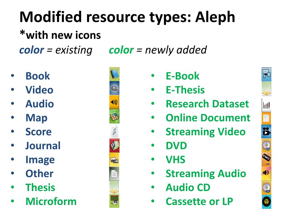 Modified resource types: Aleph*with new iconscolor = existing color = newly added • Book • Video • Audio • Map • Score • Journal • Image • Other • Thesis • Microform • E-Book • E-Thesis • Research Dataset • Online Document • Streaming Video • DVD • VHS • Streaming Audio • Audio CD • Cassette or LP