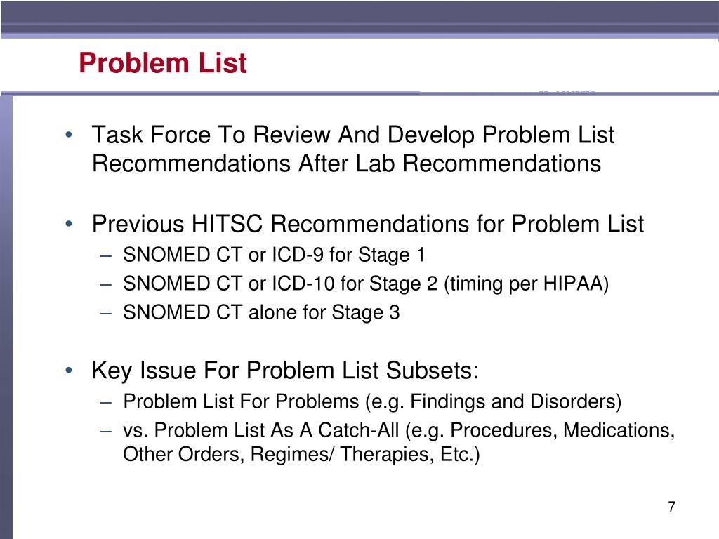 Problem List • Task Force To Review And Develop Problem List Recommendations After Lab Recommendations • Previous HITSC Recommendations for Problem List • SNOMED CT or ICD-9 for Stage 1 • SNOMED CT or ICD-10 for Stage 2 (timing per HIPAA) • SNOMED CT alone for Stage 3 • Key Issue For Problem List Subsets: • Problem List For Problems (e.g. Findings and Disorders) • vs. Problem List As A Catch-All (e.g. Procedures, Medications, Other Orders, Regimes/ Therapies, Etc.)