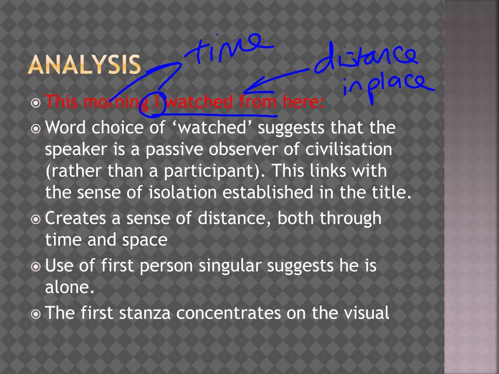 ANALYSIS • This morning I watched from here: • Word choice of ‘watched’ suggests that the speaker is a passive observer of civilisation (rather than a participant). This links with the sense of isolation established in the title. • Creates a sense of distance, both through time and space • Use of first person singular suggests he is alone. • The first stanza concentrates on the visual