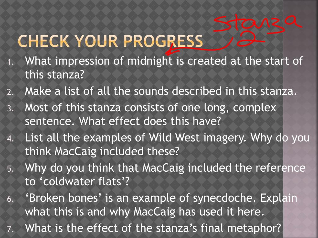 CHECK YOUR PROGRESS • What impression of midnight is created at the start of this stanza? • Make a list of all the sounds described in this stanza. • Most of this stanza consists of one long, complex sentence. What effect does this have? • List all the examples of Wild West imagery. Why do you think MacCaig included these? • Why do you think that MacCaig included the reference to ‘coldwater flats’? • ‘Broken bones’ is an example of synecdoche. Explain what this is and why MacCaig has used it here. • What is the effect of the stanza’s final metaphor?