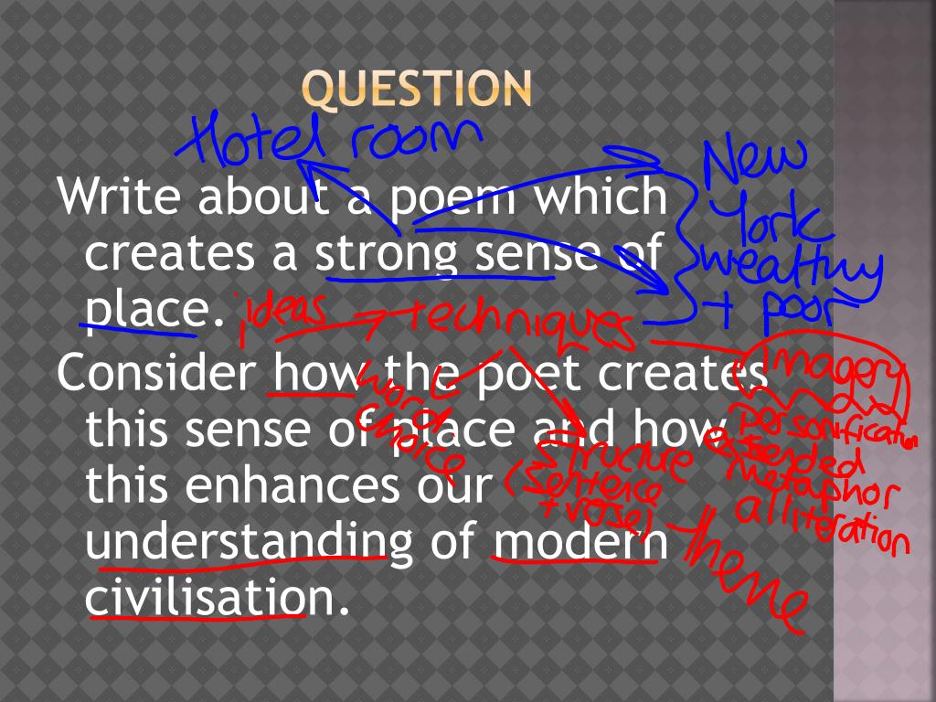 QUESTION Write about a poem which creates a strong sense of place. Consider how the poet creates this sense of place and how this enhances our understanding of modern civilisation.
