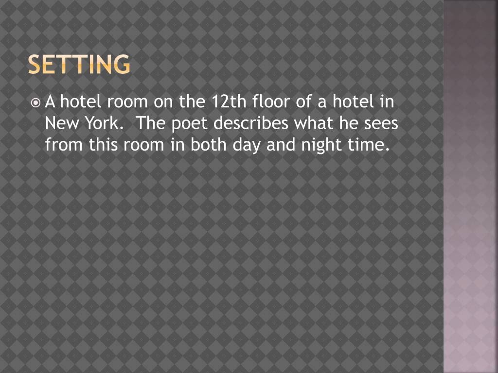 Setting • A hotel room on the 12th floor of a hotel in New York. The poet describes what he sees from this room in both day and night time.