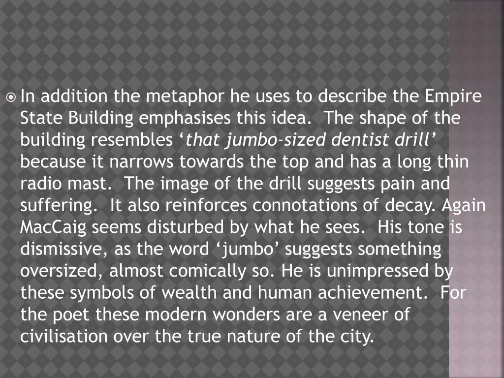 In addition the metaphor he uses to describe the Empire State Building emphasises this idea. The shape of the building resembles ‘that jumbo-sized dentist drill’ because it narrows towards the top and has a long thin radio mast. The image of the drill suggests pain and suffering. It also reinforces connotations of decay. Again MacCaigseems disturbed by what he sees. His tone is dismissive, as the word ‘jumbo’ suggests something oversized, almost comically so. He is unimpressed by these symbols of wealth and human achievement. For the poet these modern wonders are a veneer of civilisation over the true nature of the city.