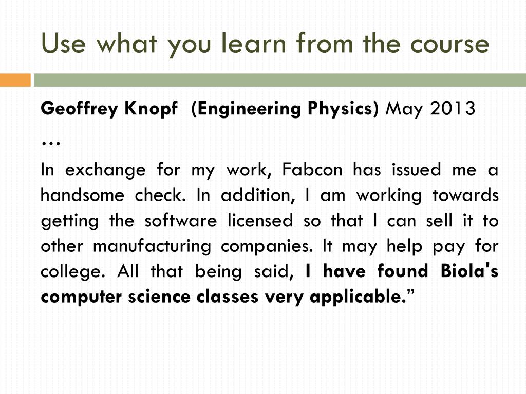 Use what you learn from the course Geoffrey Knopf (Engineering Physics) May 2013 … In exchange for my work, Fabcon has issued me a handsome check. In addition, I am working towards getting the software licensed so that I can sell it to other manufacturing companies. It may help pay for college. All that being said, I have found Biola's computer science classes very applicable.”