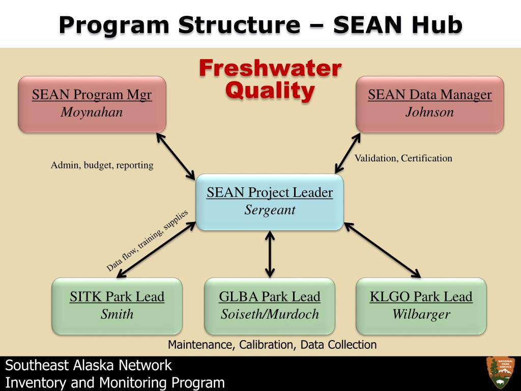 Program Structure – SEAN Hub Freshwater Quality SEAN Program Mgr Moynahan SEAN Data Manager Johnson Validation, Certification Admin, budget, reporting SEAN Project Leader Sergeant Data flow, training, supplies SITK Park Lead Smith GLBA Park Lead Soiseth/Murdoch KLGO Park Lead Wilbarger Maintenance, Calibration, Data Collection Southeast Alaska Network Inventory and Monitoring Program