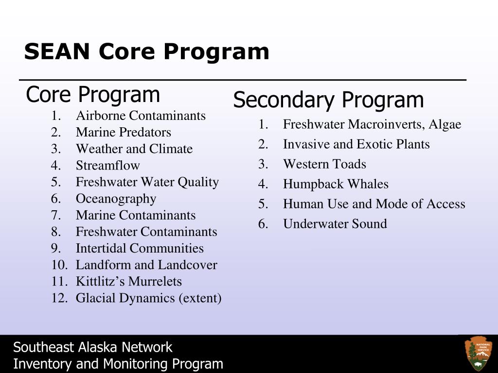 Core Program Airborne Contaminants Marine Predators Weather and Climate Streamflow Freshwater Water Quality Oceanography Marine Contaminants Freshwater Contaminants Intertidal Communities Landform and Landcover Kittlitz’s Murrelets Glacial Dynamics (extent) Secondary Program Freshwater Macroinverts, Algae Invasive and Exotic Plants Western Toads Humpback Whales Human Use and Mode of Access Underwater Sound SEAN Core Program Southeast Alaska Network Inventory and Monitoring Program