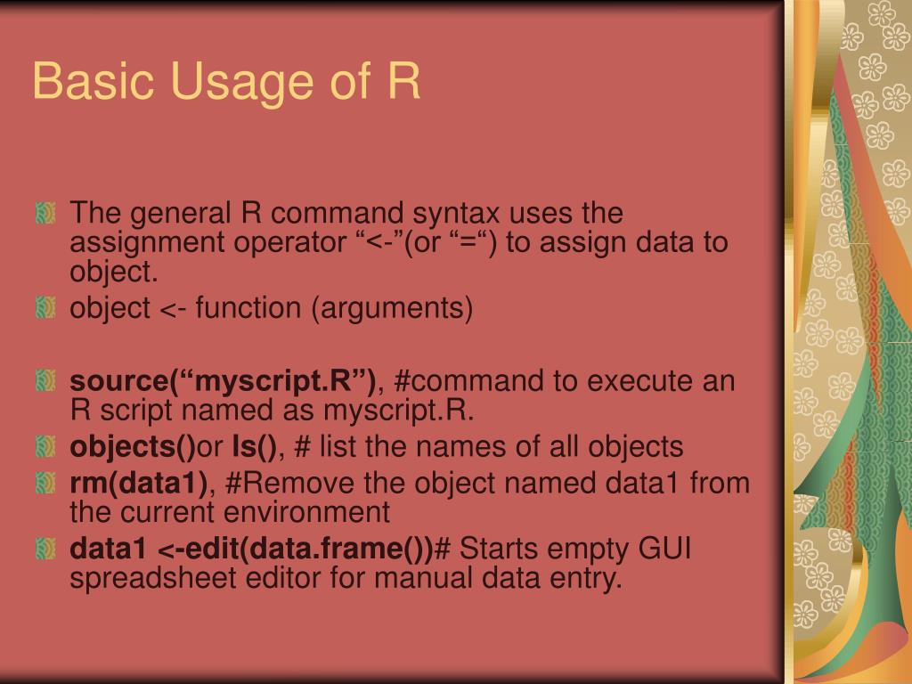 Basic Usage of R • The general R command syntax uses the assignment operator “<-”(or “=“) to assign data to object. • object <- function (arguments) • source(“myscript.R”), #command to execute an R script named as myscript.R. • objects()or ls(), # list the names of all objects • rm(data1), #Remove the object named data1 from the current environment • data1 <-edit(data.frame())# Starts empty GUI spreadsheet editor for manual data entry.