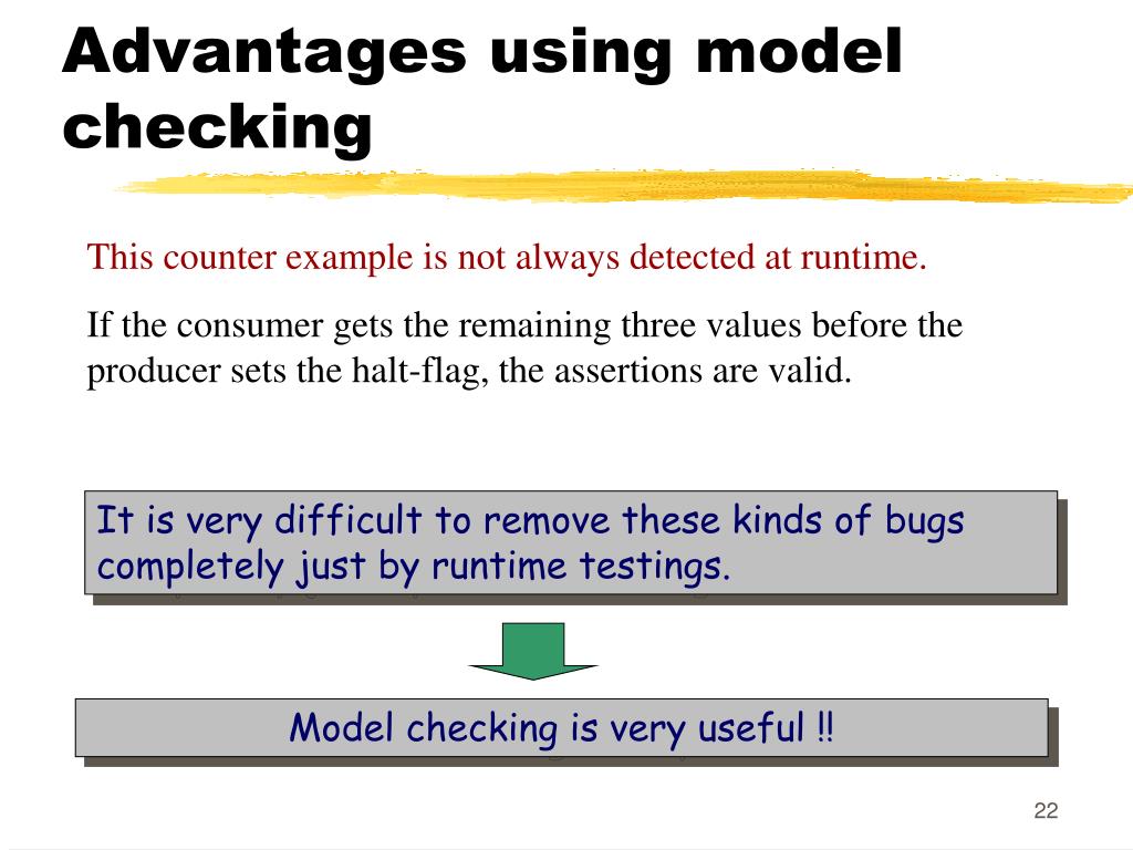 Advantages using model checking This counter example is not always detected at runtime. If the consumer gets the remaining three values before the producer sets the halt-flag, the assertions are valid. It is very difficult to remove these kinds of bugs completely just by runtime testings. Model checking is very useful !!
