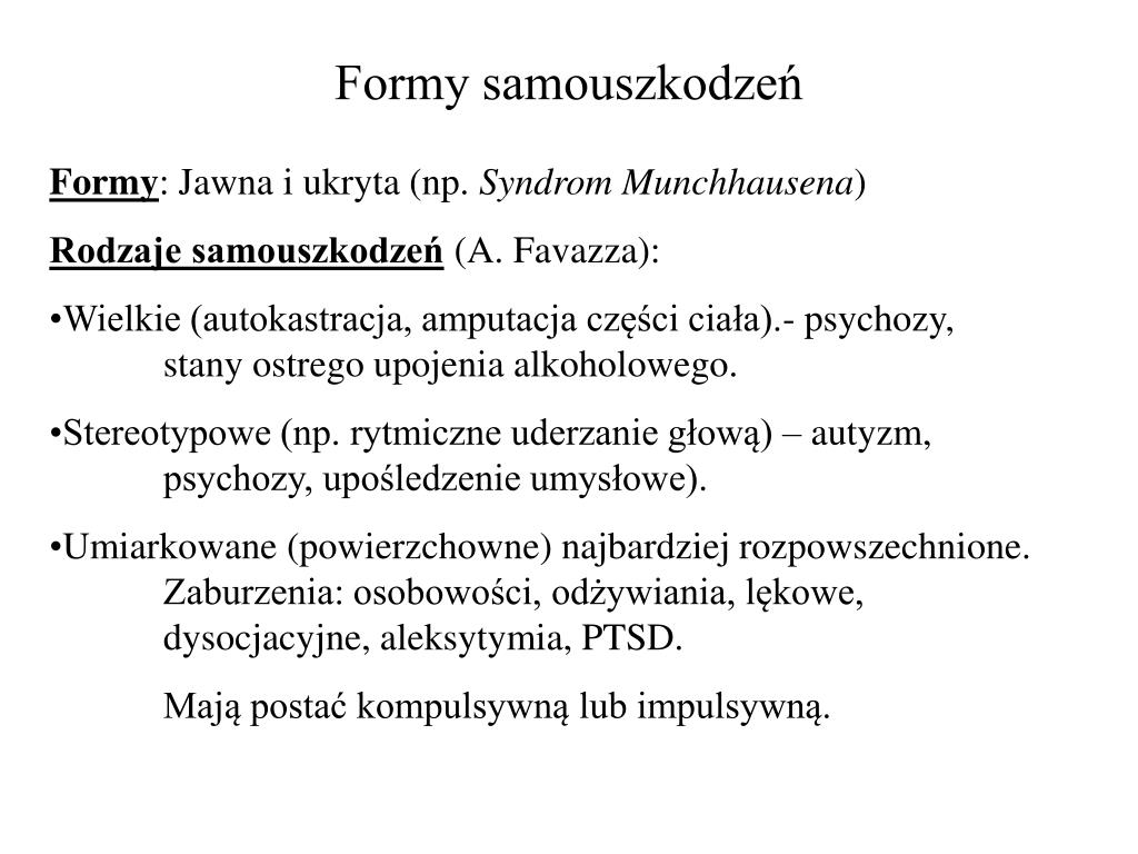 Formy samouszkodzeń • Formy: Jawna i ukryta (np. Syndrom Munchhausena) • Rodzaje samouszkodzeń (A. Favazza): • Wielkie (autokastracja, amputacja części ciała).- psychozy, stany ostrego upojenia alkoholowego. • Stereotypowe (np. rytmiczne uderzanie głową) – autyzm, psychozy, upośledzenie umysłowe). • Umiarkowane (powierzchowne) najbardziej rozpowszechnione. Zaburzenia: osobowości, odżywiania, lękowe, dysocjacyjne, aleksytymia, PTSD. • Mają postać kompulsywną lub impulsywną.