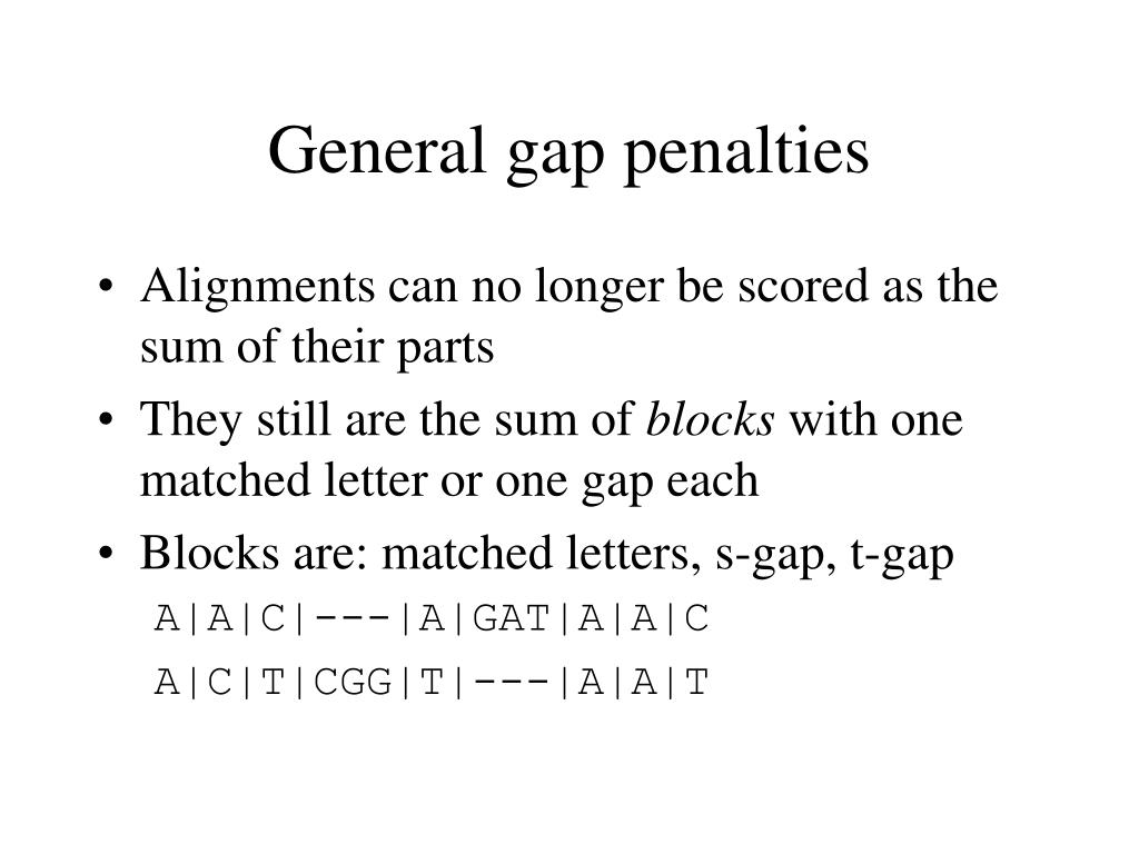 General gap penalties • Alignments can no longer be scored as the sum of their parts • They still are the sum of blocks with one matched letter or one gap each • Blocks are: matched letters, s-gap, t-gap A|A|C|---|A|GAT|A|A|C A|C|T|CGG|T|---|A|A|T