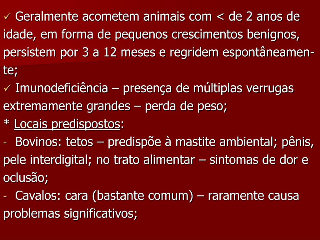 Geralmente acometem animais com < de 2 anos de idade, em forma de pequenos crescimentos benignos, persistem por 3 a 12 meses e regridem espontâneamen- te; • Imunodeficiência – presença de múltiplas verrugas extremamente grandes – perda de peso; * Locais predispostos: • Bovinos: tetos – predispõe à mastite ambiental; pênis, pele interdigital; no trato alimentar – sintomas de dor e oclusão; • Cavalos: cara (bastante comum) – raramente causa problemas significativos;