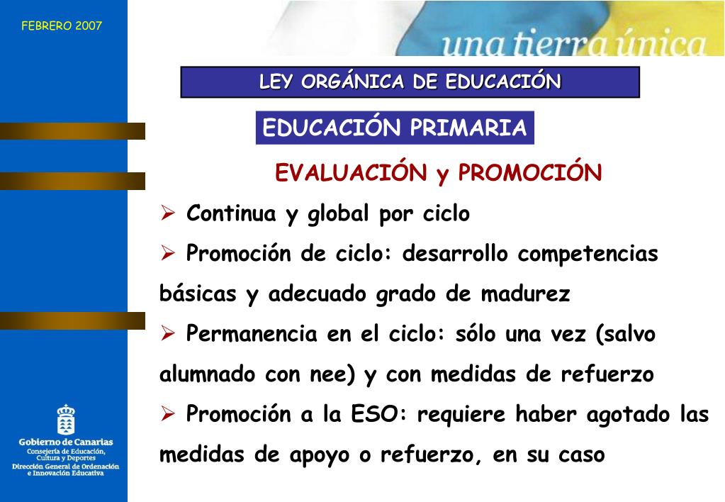 FEBRERO 2007 LEY ORGÁNICA DE EDUCACIÓN EDUCACIÓN PRIMARIA EVALUACIÓN y PROMOCIÓN • Continua y global por ciclo • Promoción de ciclo: desarrollo competencias básicas y adecuado grado de madurez • Permanencia en el ciclo: sólo una vez (salvo alumnado con nee) y con medidas de refuerzo • Promoción a la ESO: requiere haber agotado las medidas de apoyo o refuerzo, en su caso
