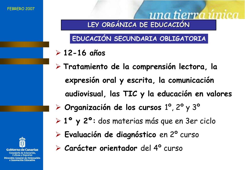 FEBRERO 2007 LEY ORGÁNICA DE EDUCACIÓN EDUCACIÓN SECUNDARIA OBLIGATORIA • 12-16 años • Tratamiento de la comprensión lectora, la • expresión oral y escrita, la comunicación • audiovisual, las TIC y la educación en valores • Organización de los cursos 1º, 2º y 3º • 1º y 2º: dos materias más que en 3er ciclo • Evaluación de diagnóstico en 2º curso • Carácter orientador del 4º curso