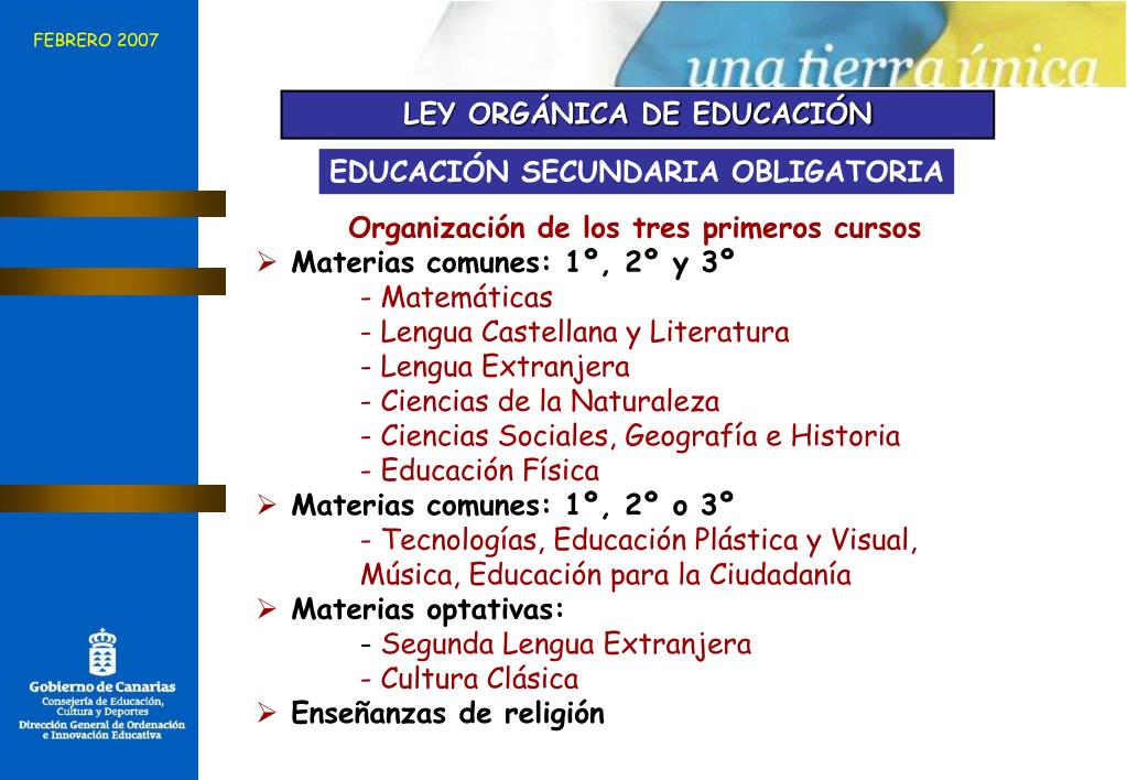 FEBRERO 2007 LEY ORGÁNICA DE EDUCACIÓN EDUCACIÓN SECUNDARIA OBLIGATORIA Organización de los tres primeros cursos • Materias comunes: 1º, 2º y 3º - Matemáticas - Lengua Castellana y Literatura - Lengua Extranjera - Ciencias de la Naturaleza - Ciencias Sociales, Geografía e Historia - Educación Física • Materias comunes: 1º, 2º o 3º - Tecnologías, Educación Plástica y Visual, Música, Educación para la Ciudadanía • Materias optativas: - Segunda Lengua Extranjera - Cultura Clásica • Enseñanzas de religión
