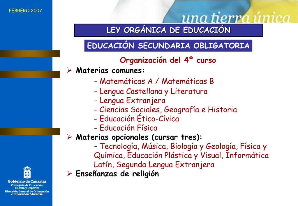FEBRERO 2007 LEY ORGÁNICA DE EDUCACIÓN EDUCACIÓN SECUNDARIA OBLIGATORIA Organización del 4º curso • Materias comunes: - Matemáticas A / Matemáticas B - Lengua Castellana y Literatura - Lengua Extranjera - Ciencias Sociales, Geografía e Historia - Educación Ético-Cívica - Educación Física • Materias opcionales (cursar tres): - Tecnología, Música, Biología y Geología, Física y Química, Educación Plástica y Visual, Informática Latín, Segunda Lengua Extranjera • Enseñanzas de religión