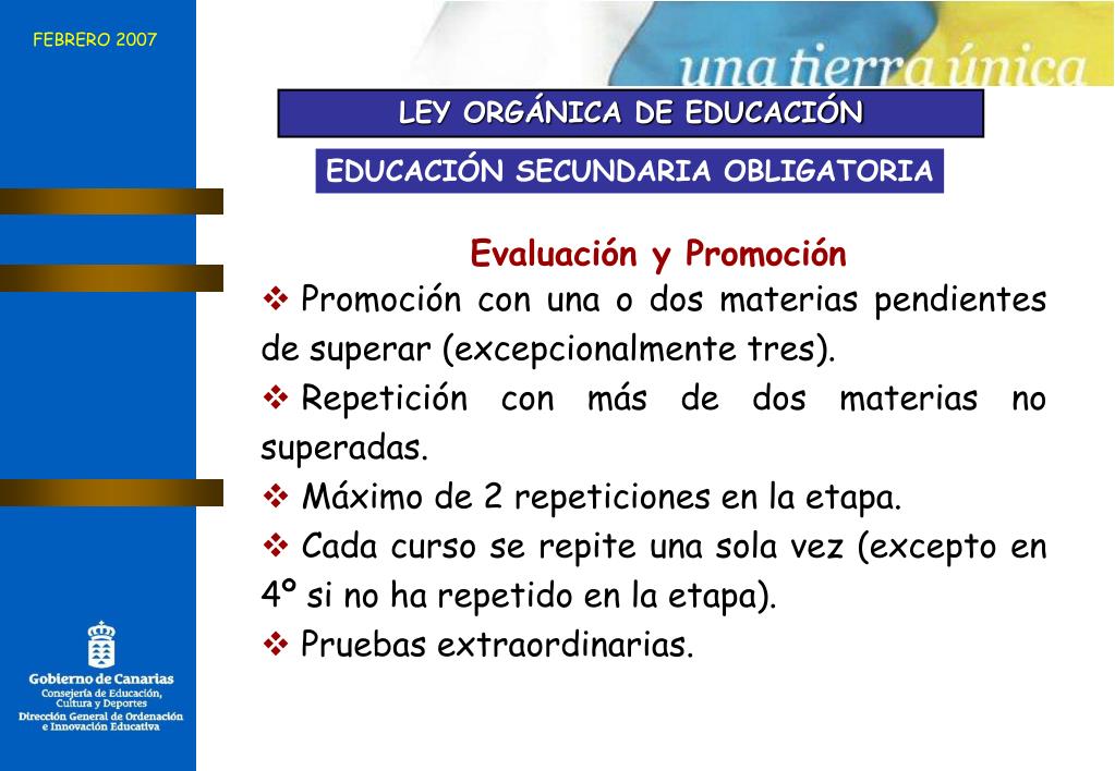 FEBRERO 2007 LEY ORGÁNICA DE EDUCACIÓN EDUCACIÓN SECUNDARIA OBLIGATORIA Evaluación y Promoción • Promoción con una o dos materias pendientes de superar (excepcionalmente tres). • Repetición con más de dos materias no superadas. • Máximo de 2 repeticiones en la etapa. • Cada curso se repite una sola vez (excepto en 4º si no ha repetido en la etapa). • Pruebas extraordinarias.