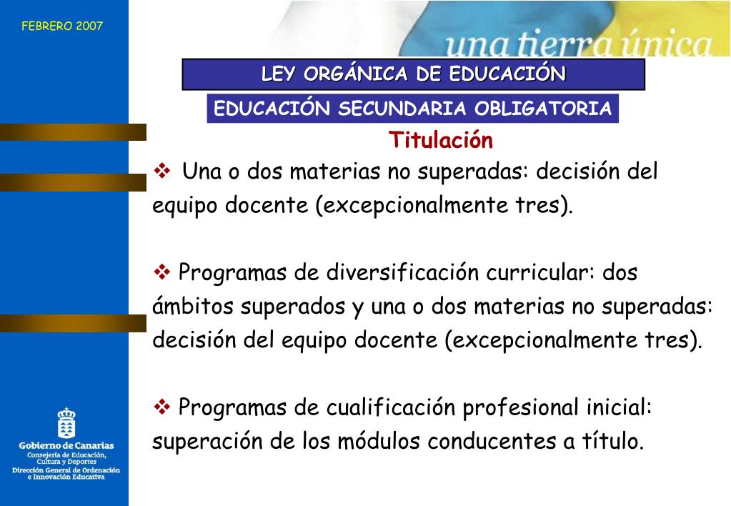 FEBRERO 2007 LEY ORGÁNICA DE EDUCACIÓN EDUCACIÓN SECUNDARIA OBLIGATORIA Titulación • Una o dos materias no superadas: decisión del equipo docente (excepcionalmente tres). • Programas de diversificación curricular: dos ámbitos superados y una o dos materias no superadas: decisión del equipo docente (excepcionalmente tres). • Programas de cualificación profesional inicial: superación de los módulos conducentes a título.