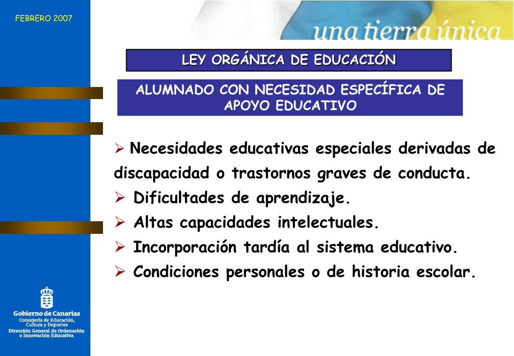 FEBRERO 2007 LEY ORGÁNICA DE EDUCACIÓN ALUMNADO CON NECESIDAD ESPECÍFICA DE APOYO EDUCATIVO • Necesidades educativas especiales derivadas de discapacidad o trastornos graves de conducta. • Dificultades de aprendizaje. • Altas capacidades intelectuales. • Incorporación tardía al sistema educativo. • Condiciones personales o de historia escolar.