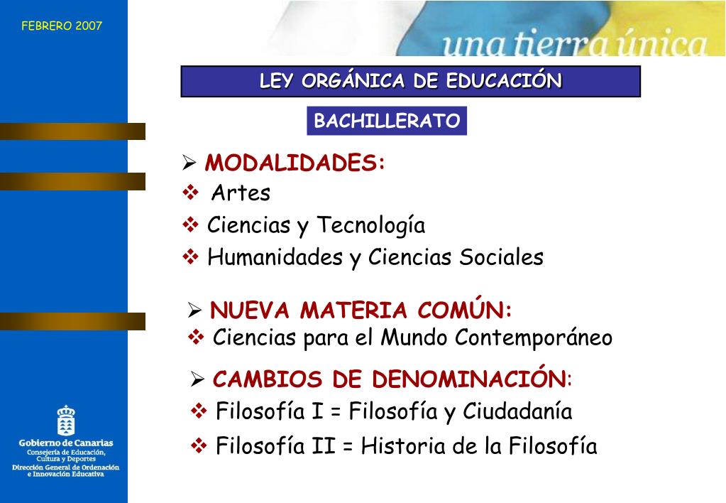 FEBRERO 2007 LEY ORGÁNICA DE EDUCACIÓN BACHILLERATO • MODALIDADES: • Artes • Ciencias y Tecnología • Humanidades y Ciencias Sociales • NUEVA MATERIA COMÚN: • Ciencias para el Mundo Contemporáneo • CAMBIOS DE DENOMINACIÓN: • Filosofía I = Filosofía y Ciudadanía • Filosofía II = Historia de la Filosofía