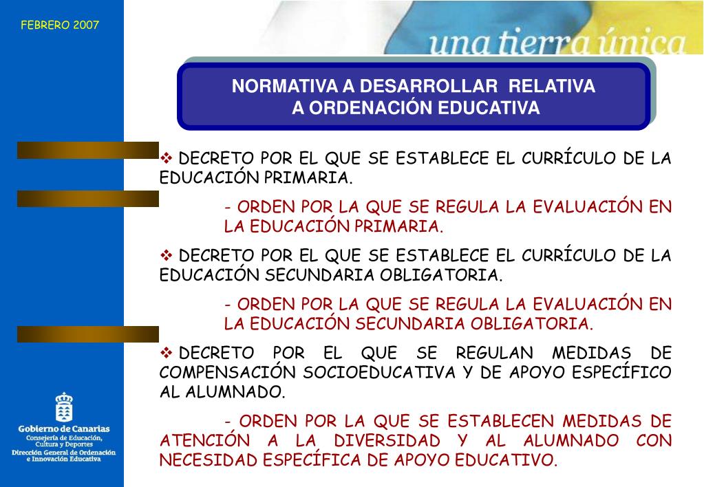 FEBRERO 2007 NORMATIVA A DESARROLLAR RELATIVA A ORDENACIÓN EDUCATIVA • DECRETO POR EL QUE SE ESTABLECE EL CURRÍCULO DE LA EDUCACIÓN PRIMARIA. - ORDEN POR LA QUE SE REGULA LA EVALUACIÓN EN LA EDUCACIÓN PRIMARIA. • DECRETO POR EL QUE SE ESTABLECE EL CURRÍCULO DE LA EDUCACIÓN SECUNDARIA OBLIGATORIA. - ORDEN POR LA QUE SE REGULA LA EVALUACIÓN EN LA EDUCACIÓN SECUNDARIA OBLIGATORIA. • DECRETO POR EL QUE SE REGULAN MEDIDAS DE COMPENSACIÓN SOCIOEDUCATIVA Y DE APOYO ESPECÍFICO AL ALUMNADO. - ORDEN POR LA QUE SE ESTABLECEN MEDIDAS DE ATENCIÓN A LA DIVERSIDAD Y AL ALUMNADO CON NECESIDAD ESPECÍFICA DE APOYO EDUCATIVO.