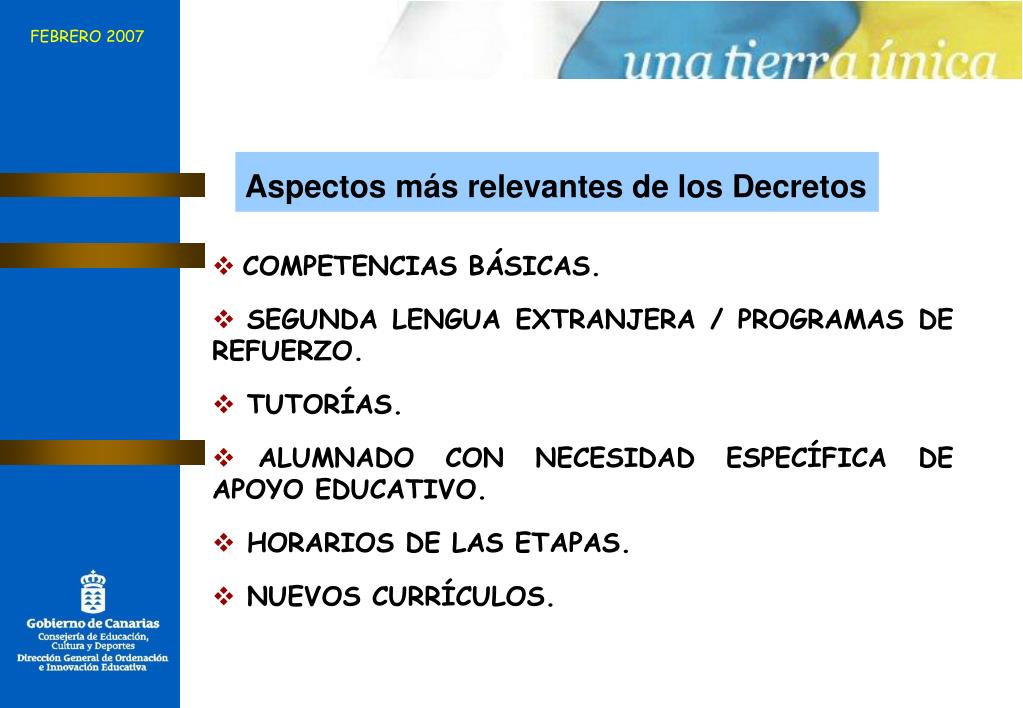 FEBRERO 2007 Aspectos más relevantes de los Decretos • COMPETENCIAS BÁSICAS. • SEGUNDA LENGUA EXTRANJERA / PROGRAMAS DE REFUERZO. • TUTORÍAS. • ALUMNADO CON NECESIDAD ESPECÍFICA DE APOYO EDUCATIVO. • HORARIOS DE LAS ETAPAS. • NUEVOS CURRÍCULOS.