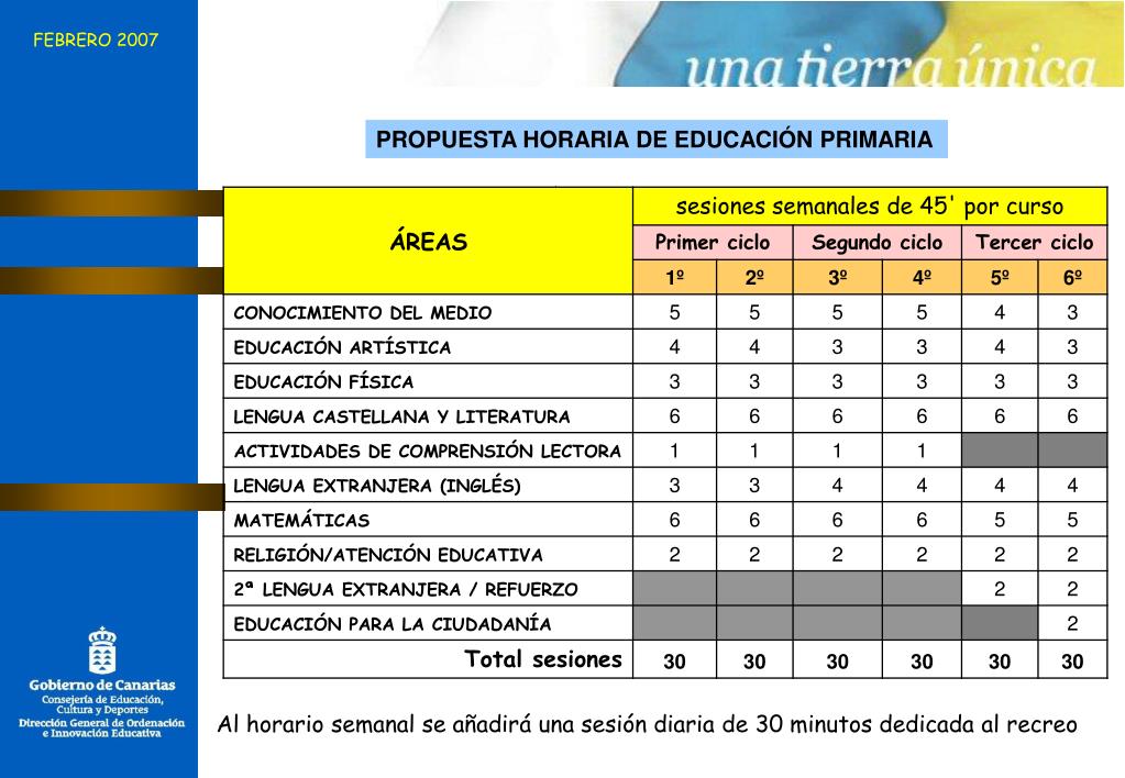 FEBRERO 2007 PROPUESTA HORARIA DE EDUCACIÓN PRIMARIA Al horario semanal se añadirá una sesión diaria de 30 minutos dedicada al recreo