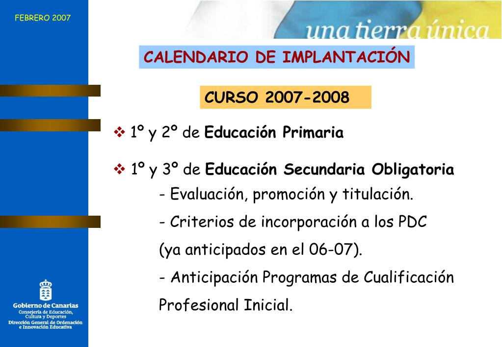 FEBRERO 2007 CALENDARIO DE IMPLANTACIÓN CURSO 2007-2008 • 1º y 2º de Educación Primaria • 1º y 3º de Educación Secundaria Obligatoria - Evaluación, promoción y titulación. • - Criterios de incorporación a los PDC • (ya anticipados en el 06-07). • - Anticipación Programas de Cualificación • Profesional Inicial.