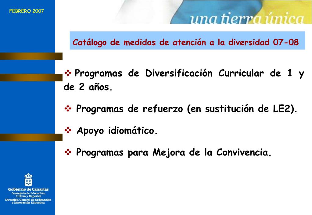 FEBRERO 2007 Catálogo de medidas de atención a la diversidad 07-08 • Programas de Diversificación Curricular de 1 y de 2 años. • Programas de refuerzo (en sustitución de LE2). • Apoyo idiomático. • Programas para Mejora de la Convivencia.